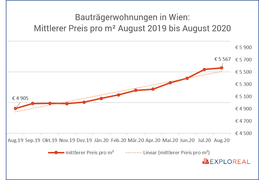 Seit Jahresbeginn 2020 ist der mittlere Angebotspreis von Bauträger-Neubauwohnungen stetig gestiegen, insgesamt seit Jänner um 11,2%. Im Vergleich zum August des Vorjahres sind die Preise um 15,5% angezogen.