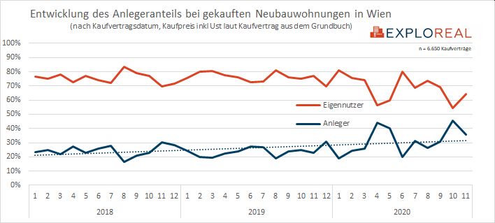 Eine Auswertung von Exploreal von 6.650 im Grundbuch verbücherten Kaufverträgen aller Bauträgerwohnungen in Wien zeigt eine markante Entwicklung beim Anteil der Anleger im Vergleich zu den Eigennutzern. In den "Corona-Monaten" April und Mai 2020 wurden über 40% der Wohnungen mit Umsatzsteuer, also zu Anlagezwecken gekauft, während Eigennutzer in diesen Monaten außergewöhnlich zurückhaltend Wohnungen gekauft haben. In den Sommermonaten wurden wieder ähnlich viele Kaufverträge von Eigennutzern abgeschlossen wie in der Zeit vor Corona. Der Oktober war mit 46% Anlegeranteil ein absoluter Rekordmonat.
