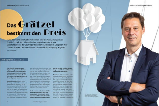 Neben aktuellen Themen wie die Auswirkungen von COVID-19 auf den Immobilienmarkt, spricht Alexander Bosak, Geschäftsführer von EXPLOREAL, in der aktuellen Ausgabe des Immobilien Magazins die ungebremst hohe Nachfrage von Investoren nach Wohnimmobilien an und erläutert warum die jahrzehntelang verwendete regionale Kenngröße des durchschnittlichen Quadratmeterpreises pro Bezirk vom Grätzelpreis abgelöst wurde. Das Interview führte Charles Steiner.