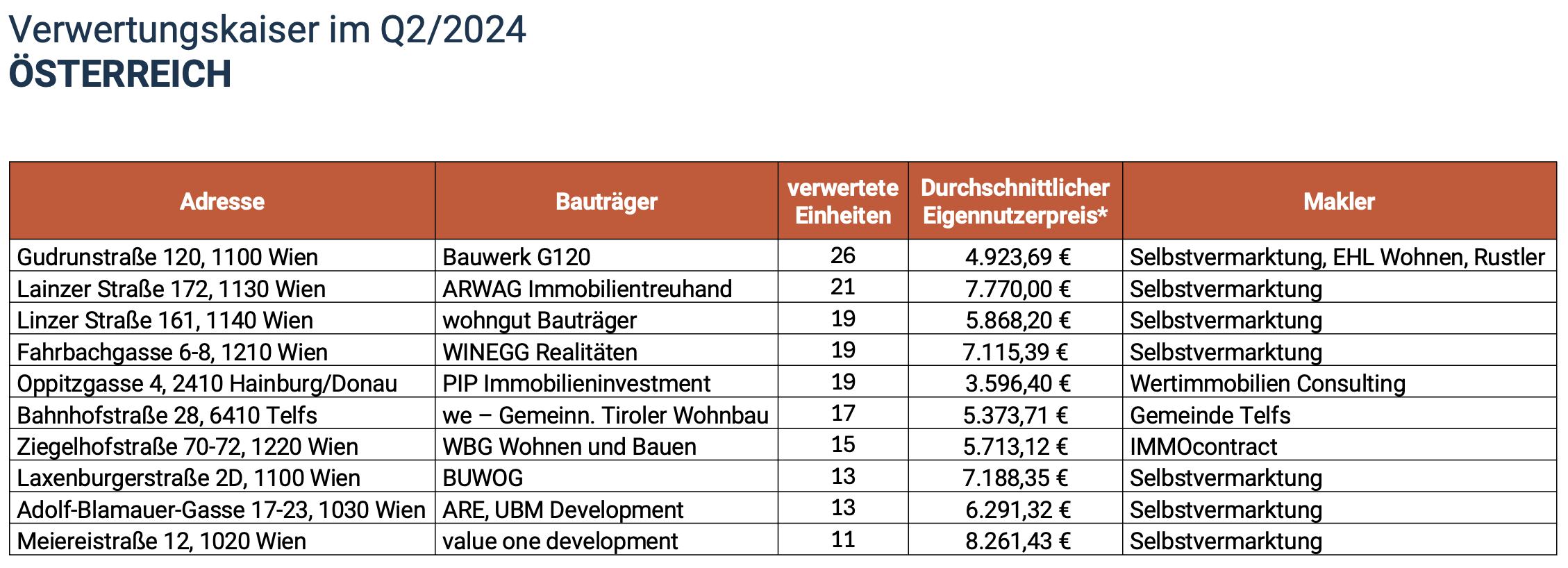 Welche Neubauprojekte wurden im 2. Quartal österreichweit besonders erfolgreich verwertet? Von welchem Bauträger wurden sie entwickelt und wer war für die Verwertung verantwortlich? Das zeigt die aktuelle Auswertung aus unserer Bauträgerdatenbank EXPLOREAL.