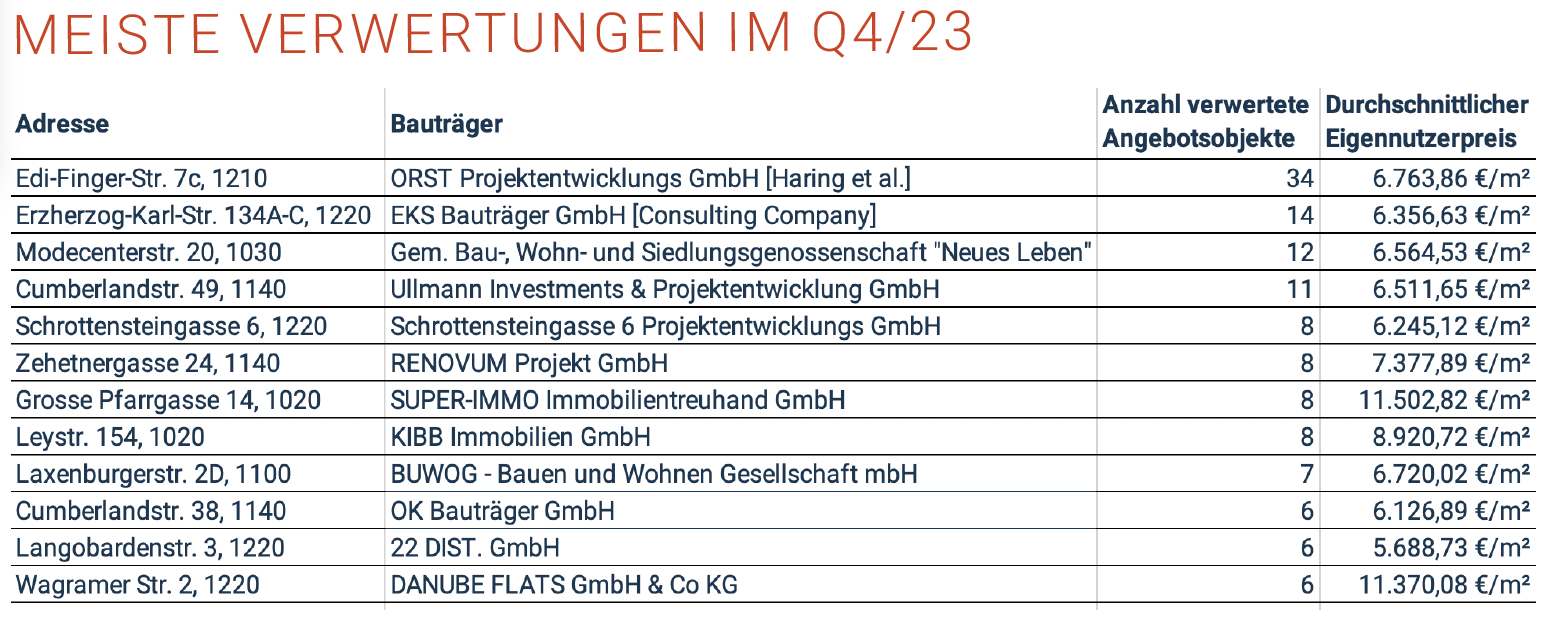 In der aktuellen Ausgabe des exklusiv für unsere Kunden erstellten, quartalsweise erscheinenden Executive Updates haben wir uns unter anderem mit den im Q4/23 besonders erfolgreich verwerteten Wiener Neubauprojekten, den sogenannten „Verwertungskaiser“ befasst, und versucht, dem Geheimnis des Erfolges auf den Grund zu gehen: