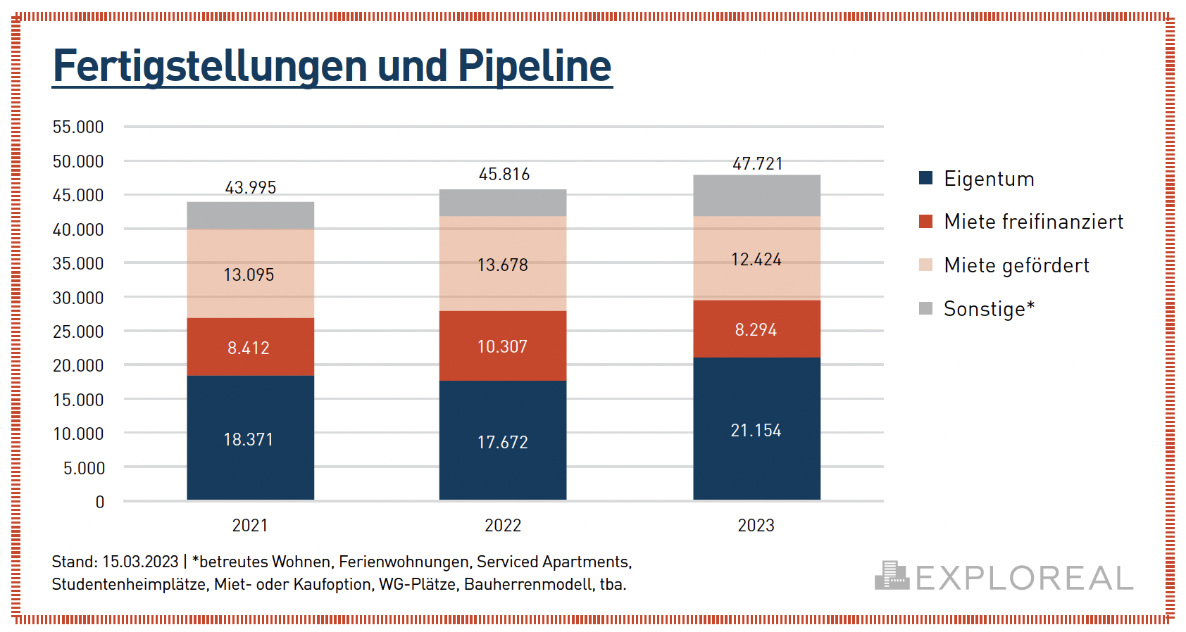 - 2023 zeichnet mit rund 47.700 fertiggestellten Wohneinheiten als weiteres Rekordjahr ab (+ 4,2% im Vergleich zu 2022) – damit ist der Zenith an Fertigstellungen voraussichtlich vorerst erreicht.