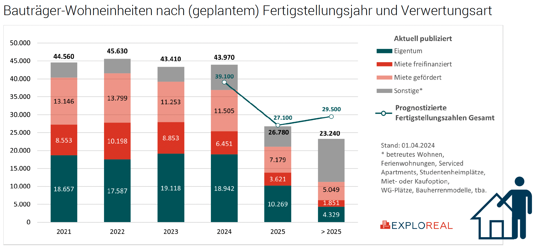 2023 wurden in Österreich rund 43.400 Wohneinheiten fertiggestellt, ein leichter Rückgang gegenüber den Vorjahren. Für 2024 wird bereits eine deutlich niedrigere Fertigstellungszahl erwartet (-10%) und für 2025 sind noch deutlich weniger Wohneinheiten in der Pipeline (-38% gegenüber 2023).