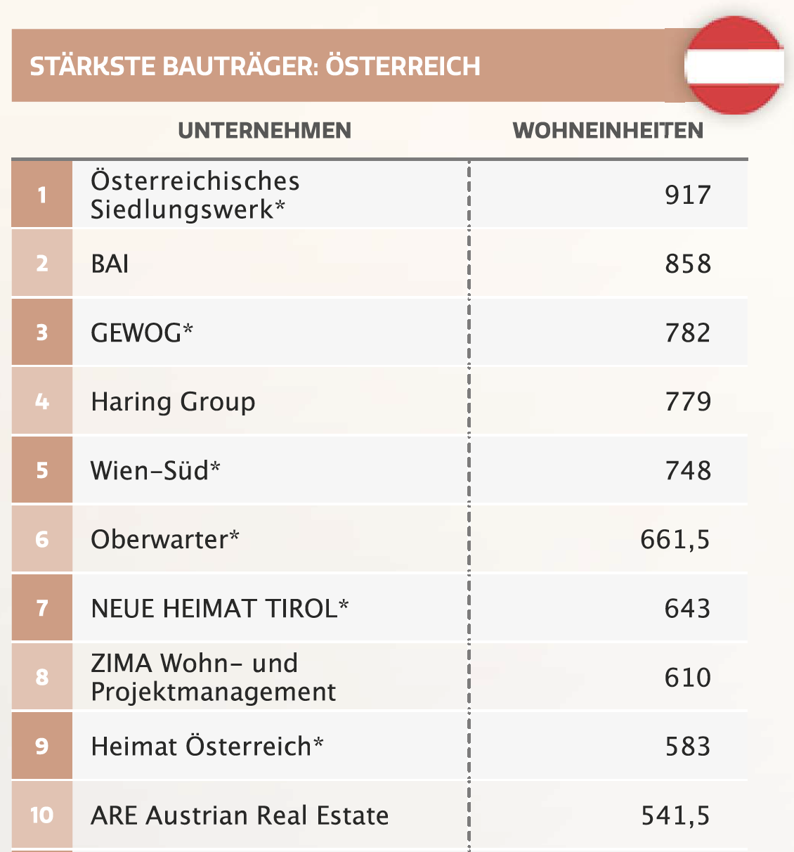 Als stärkster Bauträger Österreichs nach Neubauleistung gilt derzeit der gemeinnützige Bauträger „Österreichisches Siedlungswerk“, gefolgt von BAI und GEWOG:
