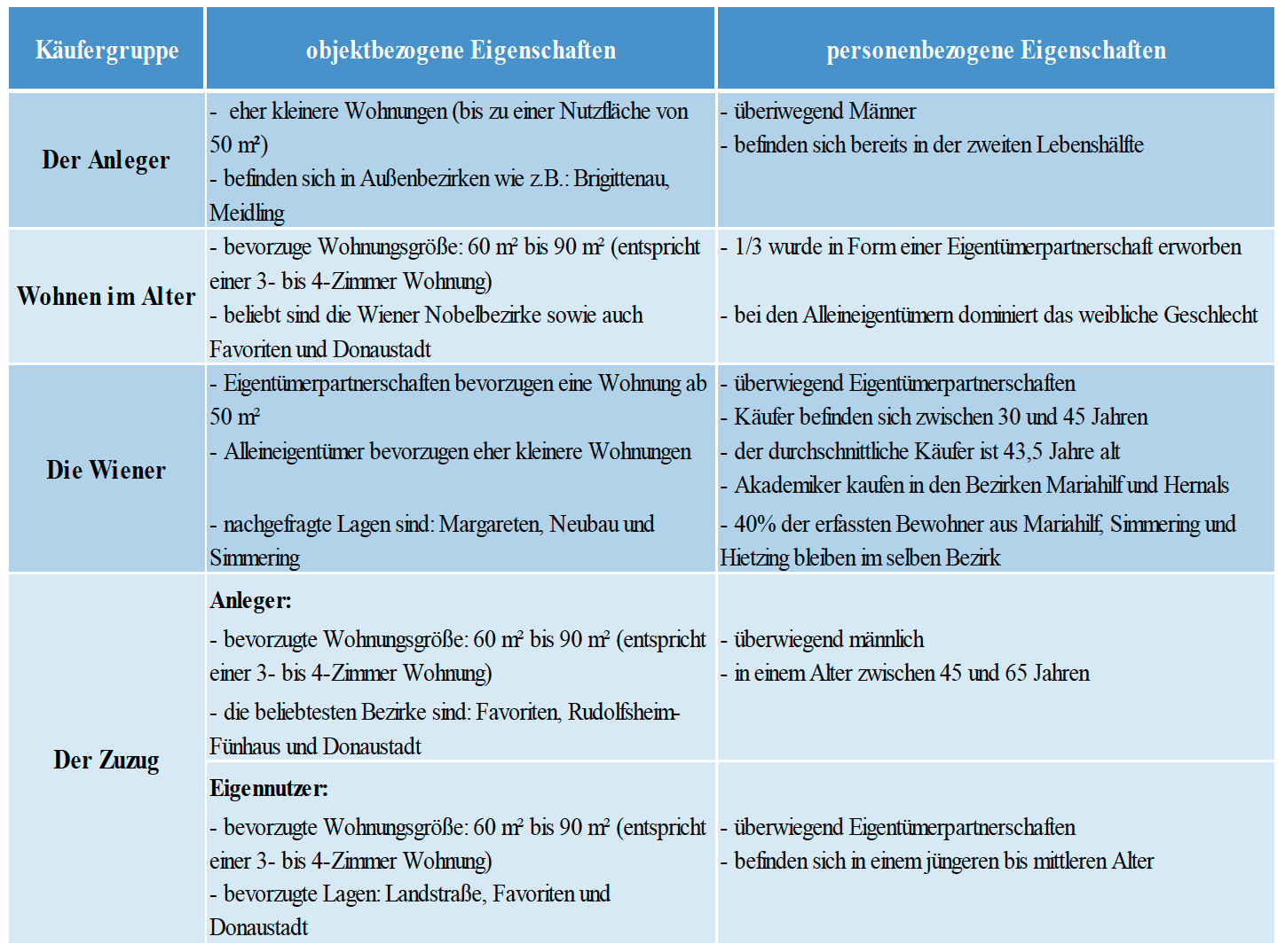 Aus der Überlegung „Welcher Käufertyp erwirbt welche Art von Wohnung?“ wurde versucht, Ähnlichkeiten zwischen den Käufern festzustellen und sie zu klassifizieren. Übergreifend zusammengefasst ist der typische Käufer männlich, 43,7 Jahre alt, wohnt bereits in Wien und kauft eine freifinanzierte Eigentumswohnung zwischen 60 und 90 m2 für den Eigenbedarf. Darüber hinaus konnten vier Käufertypen definiert werden: „Der Anleger“, „Wohnen im Alter“, „Der Wiener“ und „Der Zuzug“. Die Ermittlung dieser Käufertypen kann Bauträgern und Maklern dabei helfen, bestimmte Käufergruppen zielgerechter anzusprechen und die Vermarktung dementsprechend zu optimieren.