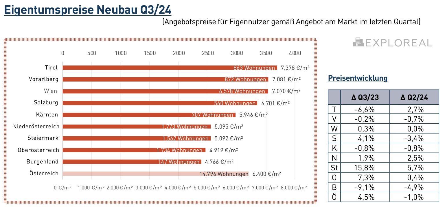 Der Preisvergleich mit dem Q3/23 zeigt eine österreichweite Preissteigerung von +4,5%, allerdings mit deutlichen regionalen Unterschieden. In Wien liegt der Preis für eine neu errichtete Wohnung im dritten Quartal des Jahres 2024 bei 7.070 €/m², österreichweit bei 6.400 €/m².