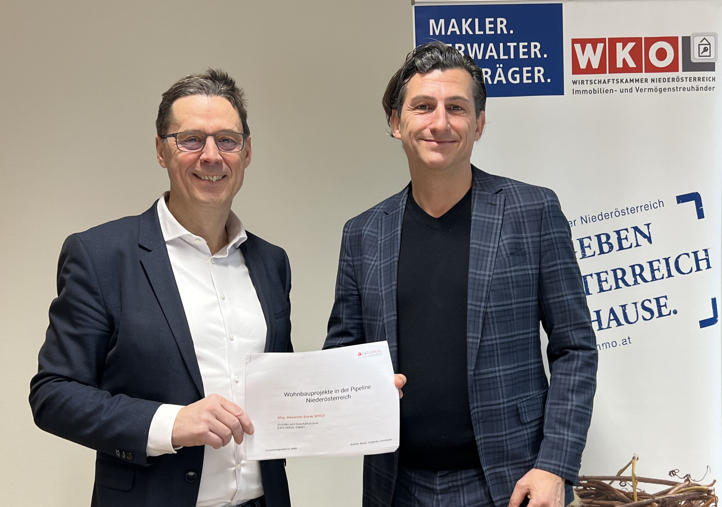 Alexander Bosak (Geschäftsführer EXPLOREAL) und Johannes Wild (Obmann der Fachgruppe der Immobilien- und Vermögenstreuhänder in der WKNÖ und stellvertretender Obmann des Fachverbandes Immobilien der WKO)