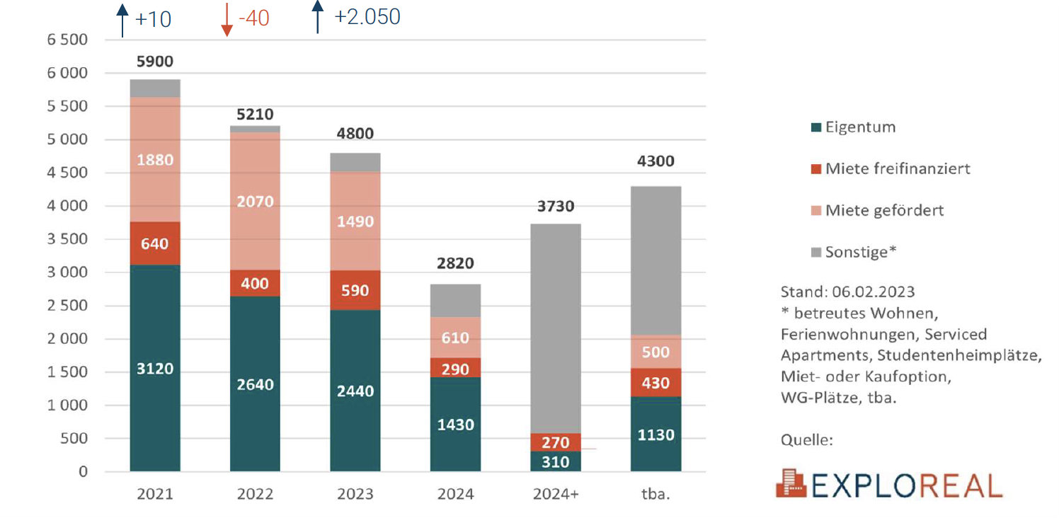 - In Oberösterreich werden heuer rund 4.800 Wohneinheiten fertiggestellt, für das folgenden Jahr 2024 sind aktuell deutlich weniger Projekte in der Pipeline (ca. 2.820 Einheiten). Die Werte liegen unter den Vorjahren (2021: ca. 5.900, 2022: ca. 5.210 Wohneinheiten)