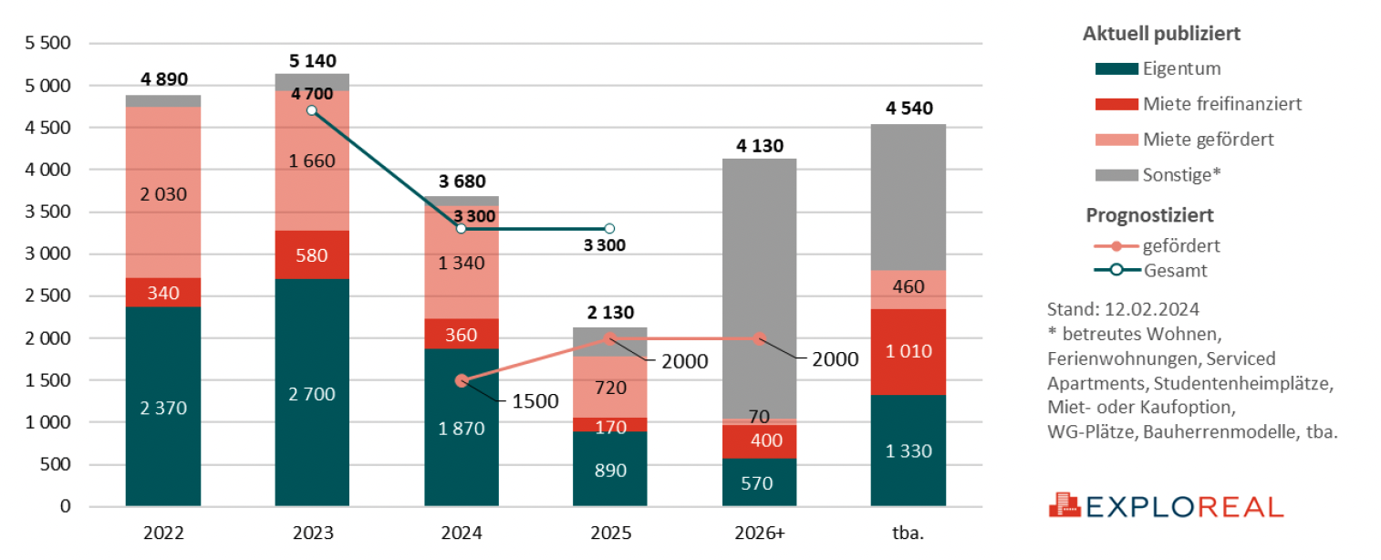 - Für die Stadt Linz ist für 2024 die Fertigstellung von nur ca. 570 Wohneinheiten publiziert, rund die Hälfte des Vorjahreswerts. Dieses niedrige Niveau hält auch im nächsten Jahr an.