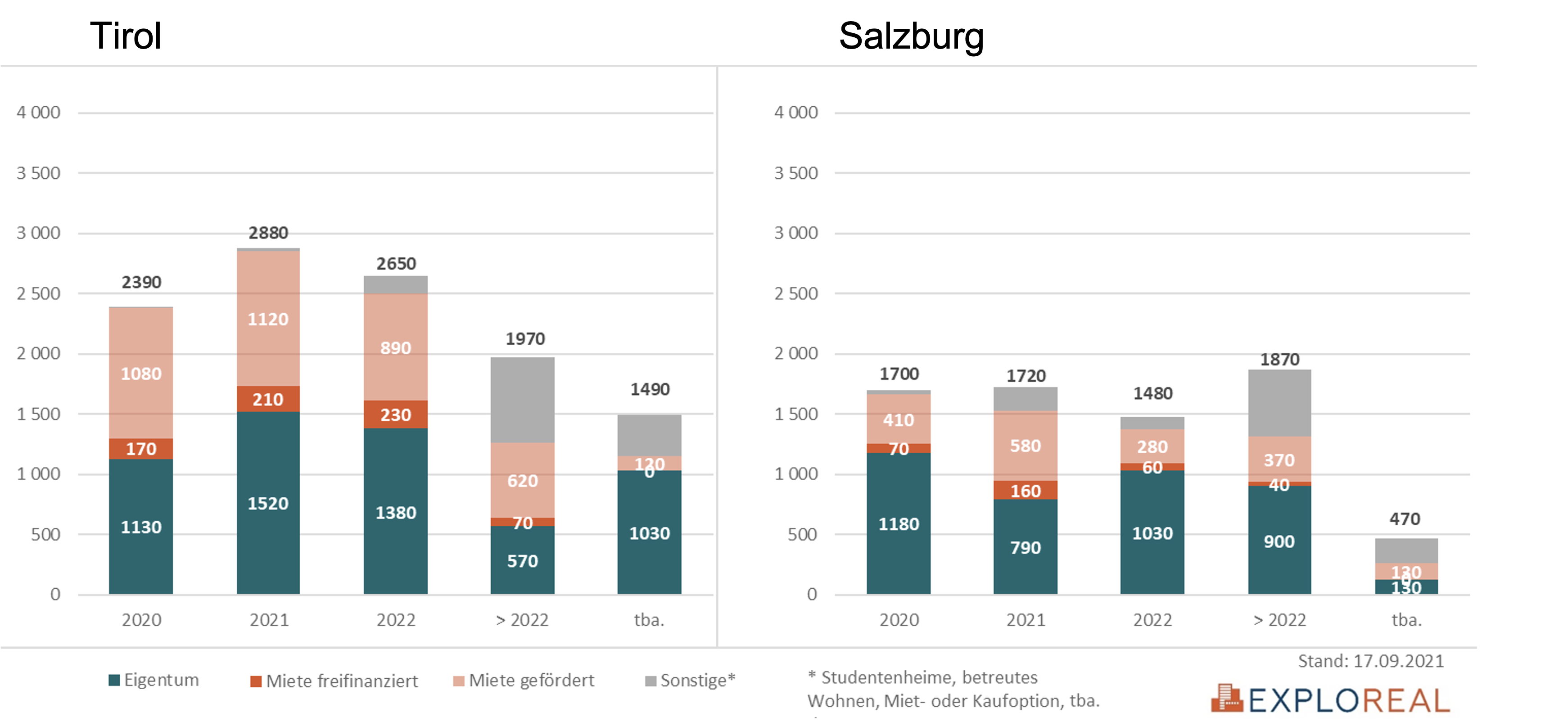 - In Tirol werden heuer ca. 2.900 Wohnungen fertiggestellt, in Salzburg ist die Neubauleistung mit 1.700 Wohnungen um einiges geringer